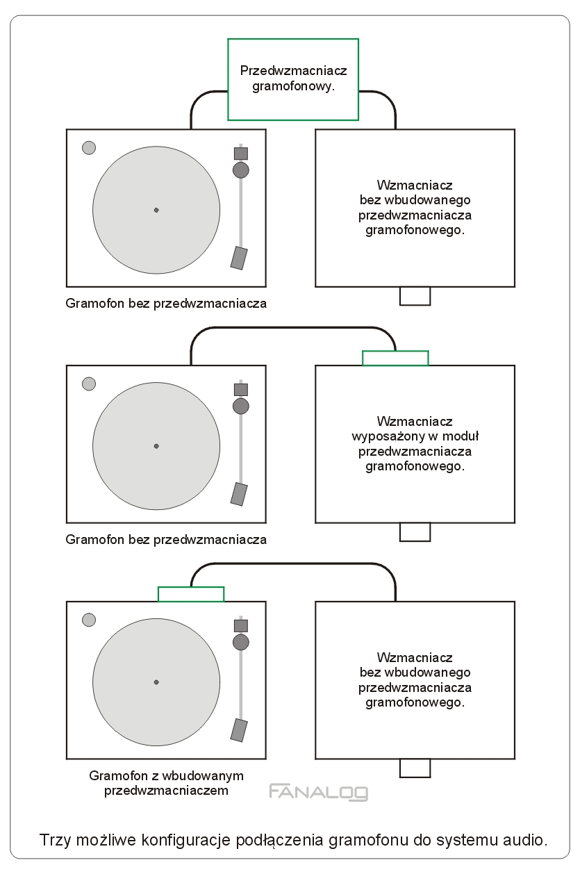 Na ilustracji przedstawiłem możliwe sposoby podłączenia gramofonu w naszym systemie audio.