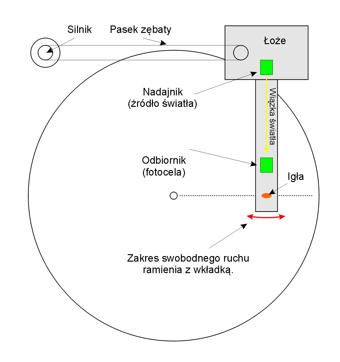 Poprzednie dwie części tekstu o ramionach liniowych były poświęcone przedstawieniu ogólnego zarysu konstrukcji oraz założeń związanych z działaniem w praktyce. Założenia są bardzo proste - odtworzyć płytę w sposób jak najbardziej zbliżony do postaci w jakiej jest ona zapisywana. Rylec zapisujący porusza się po linii prostej a większość ramion odtwarzających zatacza łuk po powierzchni płyty, co sprawia że pojawiają się niepożądane zniekształcenia sygnału. Ruch rylca zapisującego odbywa się za pośrednictwem precyzyjnego mechanizmu, przypominającego coś pomiędzy tokarką a frezarką. W przypadku ramion liniowych muszą być one podparte w co najmniej dwóch punktach co sprawia, że opór stawiany przez taki układ jest na tyle duży iż uniemożliwia swobodny ruch igły po linii prostej. Rozwiązaniem okazało się zastosowanie silnika, który przesuwa łoże z zamocowanym na nim ramieniem po prostej wzdłuż płyty. Odbywa się to poprzez zastosowanie czujnika optycznego zamocowanego na ramieniu, które porusza się pod wpływem swobodnego ruchu igły wewnątrz rowka płyty. W skrócie można opisać to tak: czujnik składa się z nadajnika wysyłającego wiązkę światła i odbiornika, który na nią reaguje. Nadajnik bywa z reguły umieszczony w podstawie poruszanej przez silnik a odbiornik na rurze ramienia. Ramię posiada pewien zakres swobody ruchu, który sprawia, że jest ono w stanie przesunąć się powiedzmy o kilka rowków wytłoczonych w płycie. W trakcie tego ruchu dochodzi do przerwania wiązki światła padającego na umieszczony na nim odbiornik co skutkuje uruchomieniem silnika, który przesuwa całość układu wzdłuż osi płyty aż do momentu ponownego oświetlenia odbiornika. Sam silnik jest z zasady umieszczony na sztywno w obudowie gramofonu a napęd na ramię podwieszone na prowadnicach przenosi się za pomocą paska. Dla łatwiejszego zrozumienia działania tego układu załączam ilustrację przedstawiającą uproszczony schemat działania.