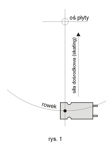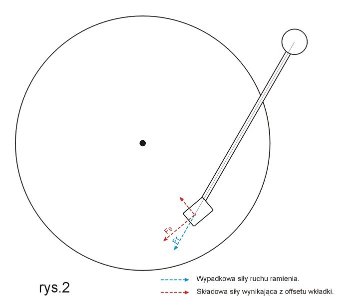 Brzmi groźnie ale postaram się w kilku zdaniach wyjaśnić o co chodzi. A chodzi o to, że gdy umieścimy na obracającej się powierzchni (płyta gramofonowa) przedmiot (igła) zamocowany na ramieniu podpartym w jednym punkcie to zadziała na niego siła ściągająca go w kierunku środka osi obrotu. Jest to spowodowane geometrią ramienia, w którym wkładka jest montowana pod pewnym kątem w stosunku do jego osi. Ten kąt określa się terminem offset i ma na celu minimalizować błąd śledzenia rowka. Ze względu na fakt, że oś pracującej we wkładce igły nie jest prostopadła do osi rury ramienia występuje dodatkowa siła, która jak już wspomniałem "ściąga" igłę w kierunku środka płyty. (rys.2). Ten problem występuje wyłącznie w ramieniach podpartych w jednym punkcie (tzw. Pivot Arm) i nie dotyczy ramion liniowych (tangencjalnych).