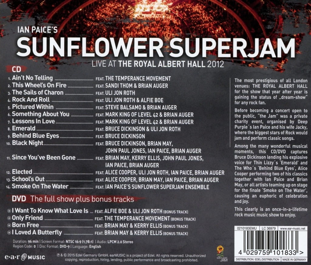 Live at the Royal Albert Hall 2012 to energetyczny album koncertowy, który dokumentuje wyjątkowy występ Iana Paice'a, perkusisty legendarnego Deep Purple, z jego projektem Sunflower Superjam. Zarejestrowany w jednym z najbardziej prestiżowych miejsc na muzycznej mapie Londynu, ten album to prawdziwa uczta dla fanów rocka, funk i jazzu.